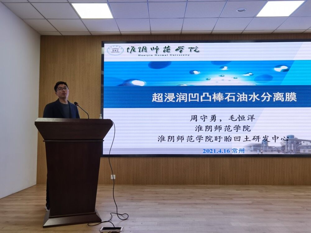 会议期间,淮师77779193永利官网院长周守勇教授参加了江苏凹凸棒石产业技术研究院院长办公(扩大)会,讨论通过了研究院2021年重点工作要点、入驻机构考核办法。毛恒洋博士作了《超浸润凹凸棒石油水分离膜》项目推介,展现了淮师研究团队在凹凸棒石高值化开发利用中发挥的积极作用。