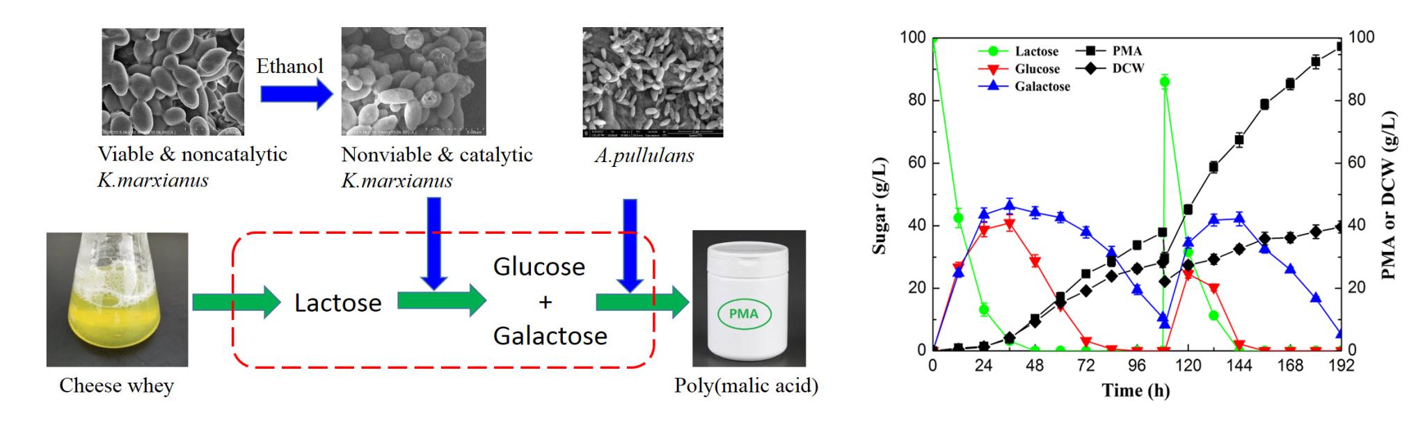 聚苹果酸是由出芽短梗霉(Aureobasidium pullulans)合成的高分子聚酯,需要在高糖环境进行发酵。因此,开发可再生的廉价碳源,对于聚苹果酸的工业化生产具有重要意义。乳清是牛奶生产奶酪过程中的副产品,其主要成分是乳糖,由于出芽短梗霉无法分泌足够的β-半乳糖苷酶水解乳糖,添加商业化β-半乳糖苷酶又提高了发酵成本,这限制了乳清在聚苹果酸发酵中的应用。为了实现乳清到聚苹果酸的直接生物转化,课题组对马克思克鲁维酵母(Kluyveromyces marxianus)的通透化处理条件及机制进行了研究,通过通透化处理获得可以高效水解乳糖的非活性酵母细胞,进一步构建通透化酵母和出芽短梗霉的共发酵体系,聚苹果酸终浓度达97.3 g/L,生产强度为0.51 g/(L·h),乳清与聚苹果酸的转化率达0.56 g/g。