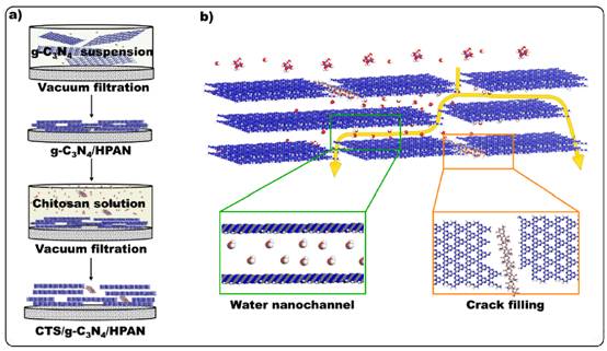 水资源的循环利用和节约无法解决因自然灾害和污染造成的淡水短缺问题。由于低能耗和高效率,纳滤和反渗透等膜技术已成为克服这一挑战的可靠选择。然而,纳滤和反渗透的主要驱动力是压力差(溶液扩散机制),由于需要高压(4-10 bar)阻碍其发展与应用。自支撑膜可以实现在低压下提供高渗透通量,这是因为自支撑膜的渗透通量不依赖压差作为主要驱动力。因此,传统纳滤膜的传质特性机制不再适用于自立式膜。作为新型的二维的膜材料,石墨相氮化碳(g-C3N4)具有优异的性能(例如,可大批量生产、廉价的成本、高化学稳定性、带负电的表面和光催化性能等)。在课题组之前的研究中,g-C3N4与水分子之间的超低摩擦已经通过实验和分子动力学模拟得到证明,这有利于水分子的扩散。此外,作为一种光催化材料,g-C3N4可以提高去除有机污染物和细菌杀菌的效率,从而减少膜污染。因此,基于 g-C3N4的自支撑膜拥有从水中离子筛分的潜力。