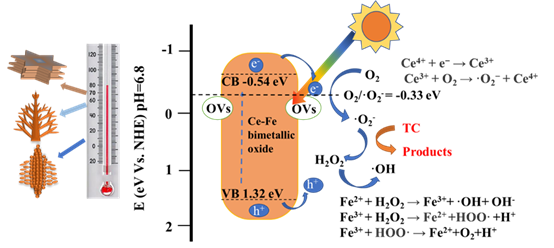 通过热解Ce-Fe普鲁士蓝前体(Ce-Fe PBAs),合成了一系列新型的Ce-Fe双金属氧化物(CFO),其对四环素(TC)的光降解显示出良好的能力。系统的表征结果表明,CFO呈现出介孔结构,两种金属均匀地分散,并有丰富的氧空位。玉米状CFO具有最大的比表面积和最强的光电流响应。在可见光下,TC可以在90分钟内被CFO光降解率达到86%以上。机理研究计算了CFO样品的能带位置,证明其产生了·OH·O2-TC的降解过程中起着关键作用,并且通过DFT计算态密度和电荷分布证明了氧空位在CFO中对降解增强的机制。