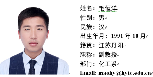 毛恒洋,男,中共党员,工学博士。2021年入选江苏省科技副总,同年当选江苏省材料学会副秘书长;2022年入选淮安市驻淮高校优秀博士;2024年入选江苏高校“青蓝工程”优秀青年骨干教师培养对象。主要研究领域为陶瓷膜材料制备及膜过程强化。主持并参与国家自然科学基金青年项目、联合基金项目、教育部产学合作协同育人项目、江苏省高等学校自然科学研究面上项目等6项;已发表研究论文40篇,包括J. Membrane Sci., ACS Appl. Mater. Interf., Sep. Purif. Technol., Desalination, 化工学报等期刊;担任Environmental Functional Materials期刊青年编委。指导学生主持大创项目4项,参加科技竞赛获奖12项。