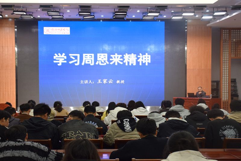 王家云教授以三个问题引入话题:“什么是恩来精神”、“为什么要学习恩来精神”、“怎么学习恩来精神”。接着,王家云教授用诸多历史事例详细的向同学们介绍了这位伟大的人民公仆周恩来总理,并列举了我国的多位领导人对恩来精神的认识以及高度评价。最后,王家云教授总结周恩来精神就是“爱人民,爱国家,爱世界”的无私精神,号召同学们要以周恩来总理为旗帜,为楷模,要发扬周总理积极进取,求真务实的精神。