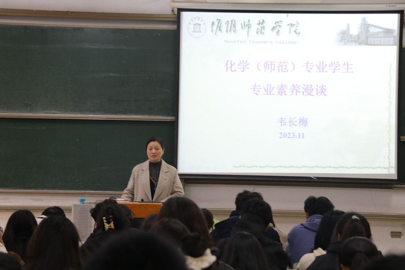 淮师新闻网11月24日电(记者 许忠堂 张妍)为更好地培养化学专业师范生的教师情怀,引导新生专业发展方向,提升专业技能,提高师范生培养质量,近期,化院关工委特邀退休教师韦长梅教授在崇文楼3-105教室为2023级师范专业学生开展化学师范专业学生素养漫谈讲座。化院党委副书记万茹主持讲座。