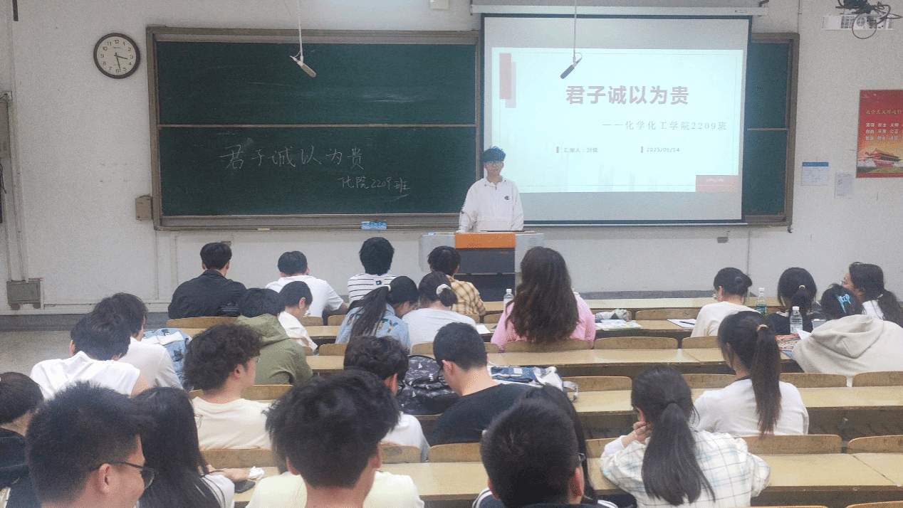 为积极响应学校“弘扬诚信文化,践行诚信美德”的号召,将优良校风、学风、考风、家风与诚信教育深度融合,引导同学们以诚待人、以信立身。5月14日晚,化院2209班于崇文阶103举办了以“君子以诚为贵”为主题的班会。