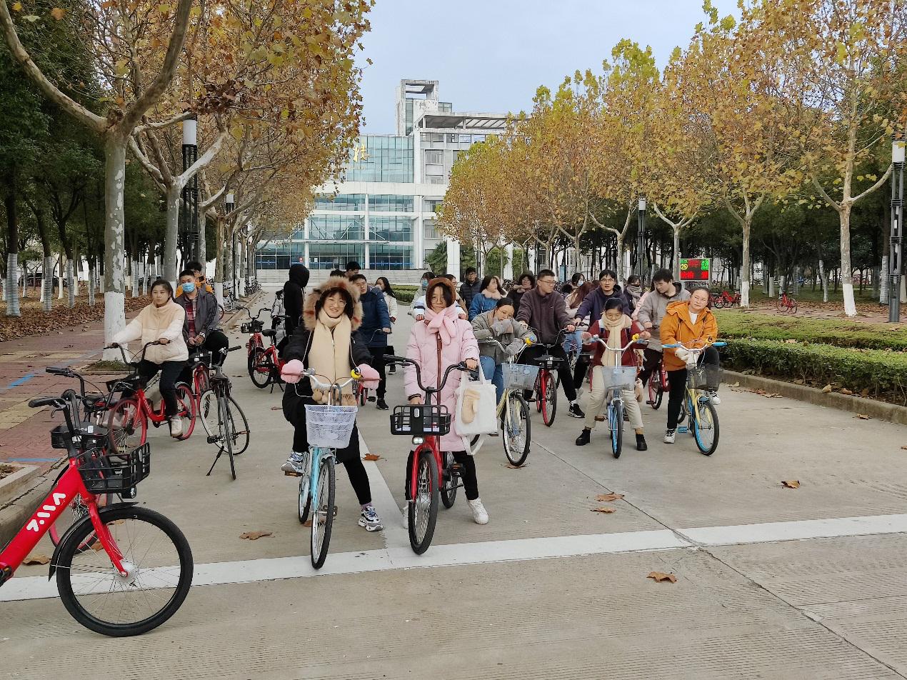 同学们个个精神饱满,骑游队伍整齐排成两行,从学校南门口出发,沿着指定的路线,路经音乐楼,弘文楼,最终抵达学校理工楼。整段路程中,同学们兴趣盎然,笑语连篇,给寒冷的冬季晕染上活力的色彩。沿途的风景在活动背景的衬托下,显得格外灵动。花坛里不惧寒冷,逆生长的花儿们,像极了不畏严寒,逆风而行的我们。路边夹杂着枯黄神色的落叶们,因我们的到来,不由自主地舞动起自己轻薄的身躯,还有那整齐排列的树先生们,伴随着同学们欢声的笑语,迎风摇曳……同学们沉浸其中,神清气爽,纷纷感慨到,此次骑行活动不仅是给环境减压,同时也是为自己解压。
