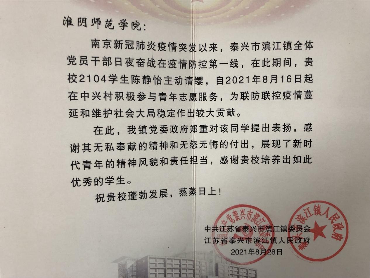 图为 滨江镇人民政府对2104陈静怡同学的表彰