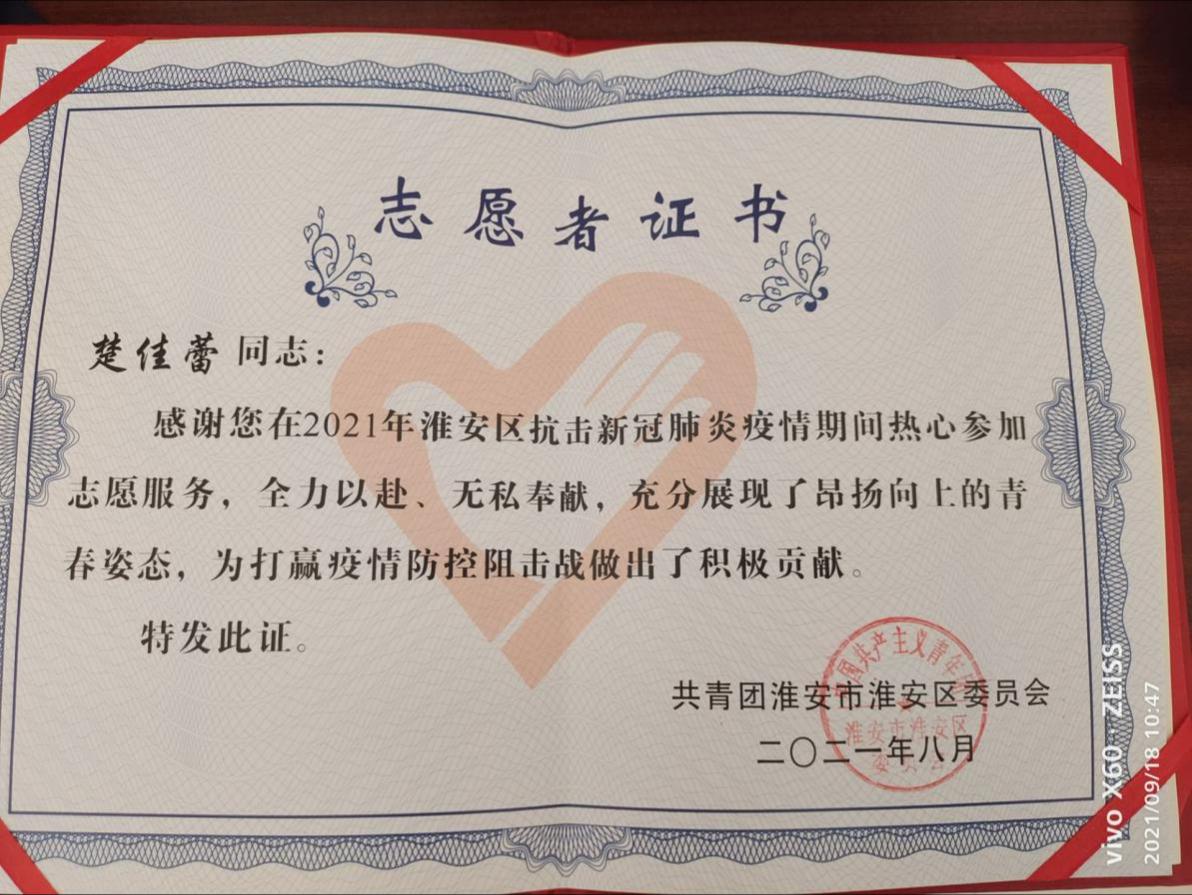 今年暑假期间,疫情再度蔓延,许多地区疫情防护岗位紧缺,不少化院学子化身志愿者,进入社区服务居民,据不完全统计,化院21届新生中有20人参与了与疫情相关的各个岗位的志愿者工作,如核酸检测点、社区门禁等等。作为当代大学生,他们通过志愿服务为疫情防控贡献了自己的一份力量,用自己的实际行动去践行了时代的使命,彰显出当代青年的责任与担当。