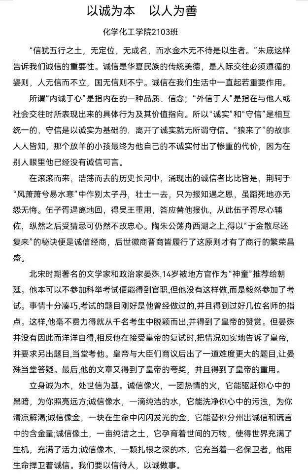 诚信是中华民族的优良传统,为深入贯彻习近平总书记关于教育的重要论述,提升大学生诚信、感恩意识和社会责任感,不断深化资助育人工作成效,培养同学们诚信的意识和诚信的良好道德品质。为进一步加强大学生诚信教育,增强诚信意识,树立诚信风尚,建设诚信校园,同时锻炼同学们的创作能力,化学化工学院于5月6日开展“内诚于心,外诚于人”的主题征文、海报及书法比赛。