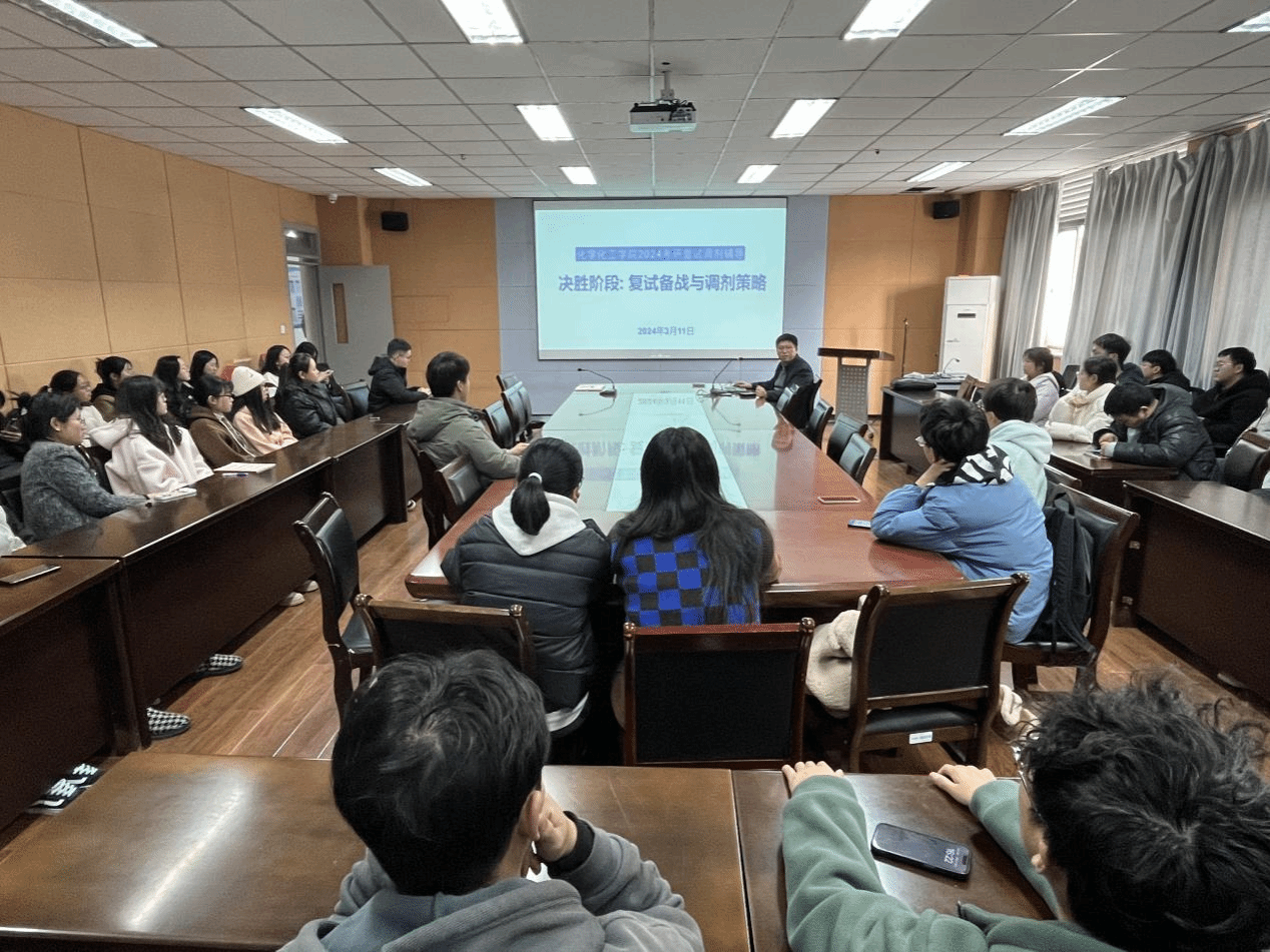 为进一步做好2024届毕业生考研复试与调剂指导服务工作,帮助考研学生熟悉复试、调剂流程和技巧,精准助力考研学子顺利上岸,77779193永利官网于3月18日下午在化学楼219会议室举办以“运筹帷幄,决胜复试”为主题的考研复试调剂指导,学院阚玉和教授主讲,学院2024届考研学生参加会议,讲座由辅导员郝子甲主持。