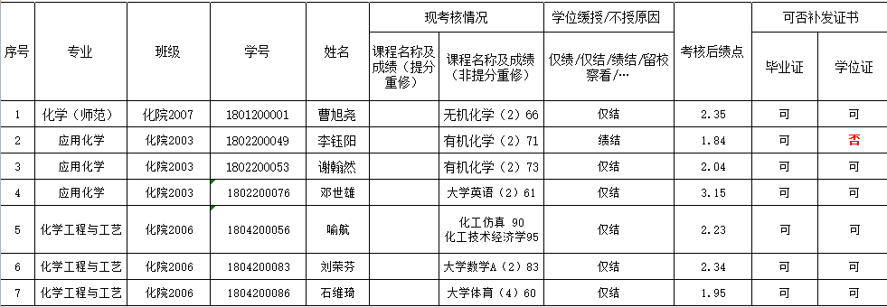 经学院考核及审查,化院2024届毕业生有7人获得补发毕业证书资格, 6人获得补发学士学位证书资格,具体名单公示如下: