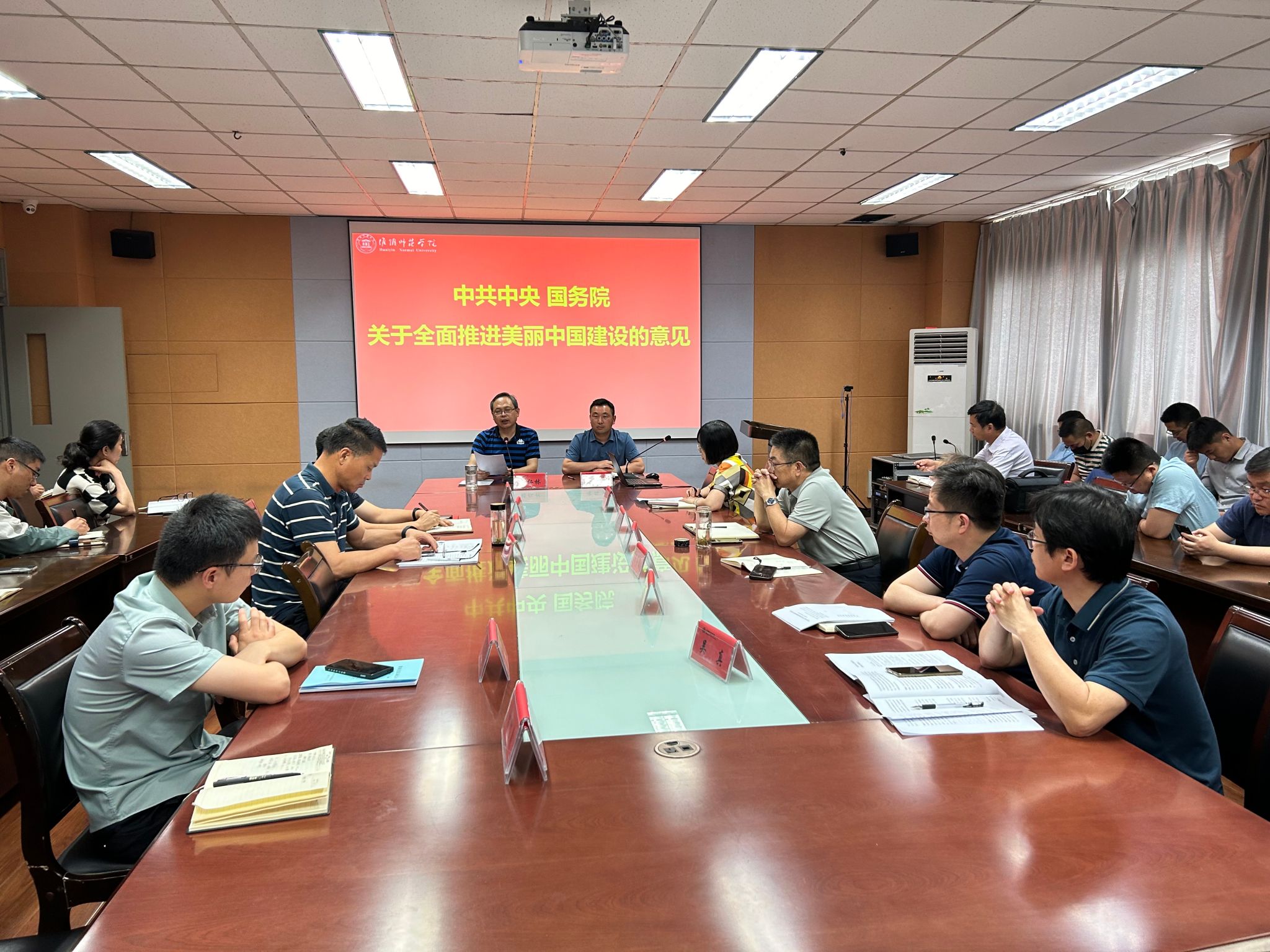 6月5日下午,化院党委书记骆仁林带领全体教师学习了《中共中央 国务院关于全面推进美丽中国建设的意见》,共同收看了淮安生态环境局发布的《携手》主题宣传片,广泛地动员教职员工参与生态环境保护、践行绿色生产方式,为全面推进美丽中国建设奠定坚实的社会基础。