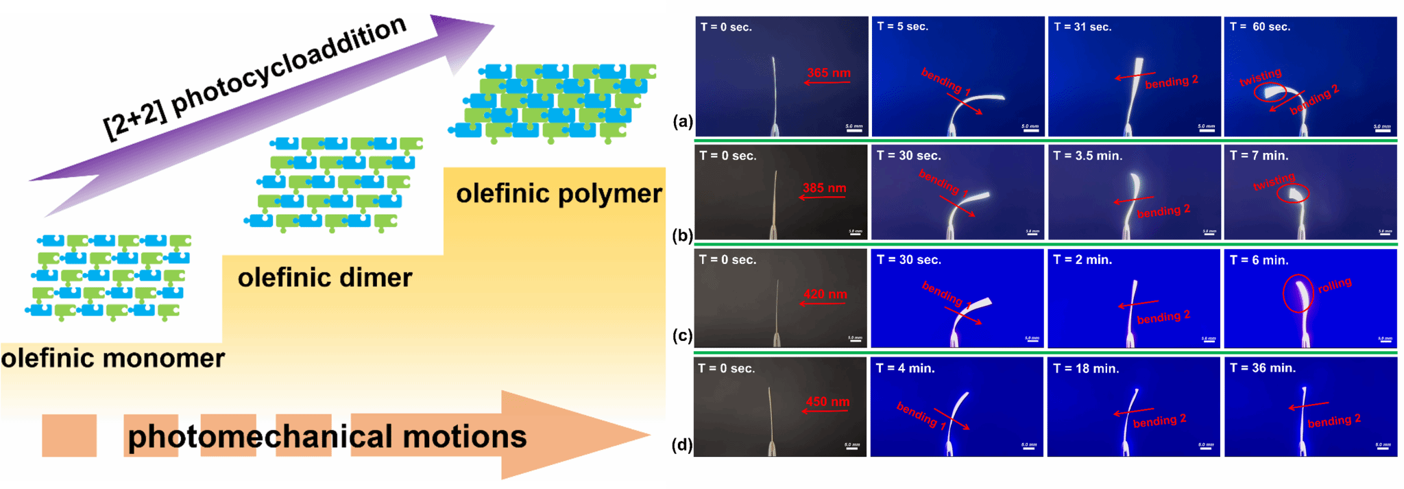 控制烯烃分子在晶体中的堆积是触发固态[2+2]光环加成反应和合成光控智能材料的关键。本文报道了两种三烯配位聚合物{[Zn(2-BBA)2(tpeb)]·(MeCN)0.5}n(1,2-HBBA=2-溴苯甲酸,tpeb=1,3,5-三-4-吡啶基-1,2-乙烯基苯)和{[Zn(3-BBA)2(tpeb)]·MeCN}n(2,3-HBBA=3-溴苯甲酸)的分步光二聚反应。在420 nm蓝紫光照射下,配位聚合物中每一对紧密排列的平行烯烃键发生[2+2]环加成反应,通过单晶到单晶(SCSC)转变,将相邻的两个Z形链连接成梯形配位链{[Zn(2-BBA)2(bpbdpvpcb)0.5]·(MeCN)0.5}n(bpbdpvpcb=1,3-双(4-吡啶基)-2,4-双(3,5-二(2-(4-吡啶基)乙烯基)苯基]环丁烯)。在发生光二聚反应后,最初距离较远的烯烃键被拉至足够近的位置,以满足进一步发生[2+2]环加成反应的要求。在进一步光照下,{[Zn(2-BBA)2(bpbdpvpcb)0.5]·(MeCN)0.5}n中相邻的bpbdpvpcb配体经历基于[2+2]光环加成的SCSC光聚合,并转化为聚-3b,4,5,5a,8b,9,10a-八氢-4,5,9,10-四吡啶基-2,7-二(2-(4-吡啶基)乙烯基)双环丁烷[e,l]-芘(poly-otpdpvdcbp)。在光照下,具有不同形貌的单晶表现出弯曲、开裂和跳跃的光机械运动。将配位聚合物的粉晶分散在聚乙烯醇(PVA)中制备的复合膜(1-PVA)显示出有趣的光波长控制光机械运动,并可在液体表面进行光驱动游泳。该工作为嵌入在配位聚合物中的光惰性烯烃对的光二聚反应提供了一种实用的新方法,并为利用烯烃配位聚合物平台合成有机聚合物开辟了一条新的途径。