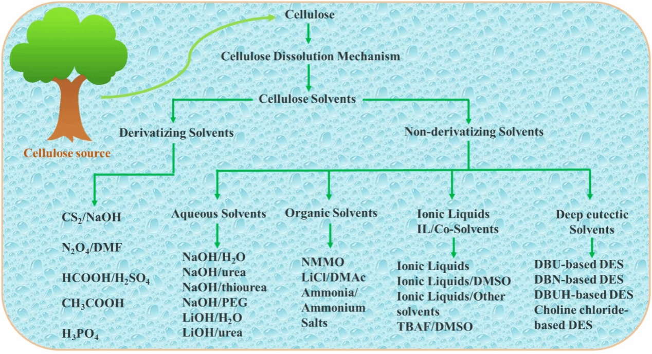 纤维素的溶解过程是将其转化为功能性增值材料的关键步骤,需要完全剖析其中的潜在机制以完善其高级加工。本文综述了纤维素溶解的各种溶剂体系,并深入探讨相关的溶解机制。考察不同溶剂包括(水溶剂、有机溶剂、离子液体、离子液体/共溶剂混合体系和深度共晶溶剂)溶解纤维素的效果,并强调了它们的局限性和优势。此外,本文还系统地概述了在这些不同溶剂体系中起作用的机制以及影响纤维素溶解性的因素。得出的结论强调了聚合度、结晶度、粒径、阳离子和阴离子的类型和大小、烷基链长、离子液体/助溶剂比、粘度、溶剂酸度、碱度和疏水相互作用在溶解过程中的综合作用。这篇论文全面综述旨在为研究人员在更广泛的背景下研究生物聚合物溶解提供有价值的见解,从而为这些溶剂系统的更广泛应用和创新提供借鉴指导作用。
