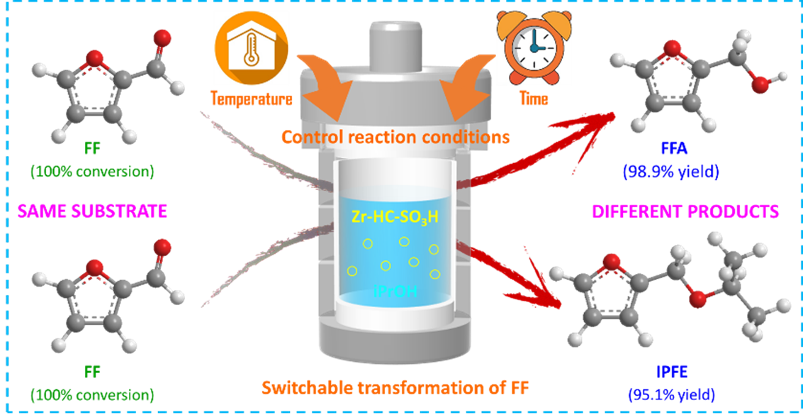 糠醛(FF)是一种极为重要的生物质基平台化合物,将其选择性转化为高附加值的糠醇(FFA)和异丙基糠基醚(IPFE)是生物质基精细化学品生产的重要途径。本文采用廉价的葡萄糖、甲烷磺酸和四氯化锆为原料,通过同步水热碳化磺化和溶剂热自组装过程合成了一种锆基双功能催化剂(Zr-HC-SO3H),该催化剂不仅引入了Lewis酸碱位点,而且引入了Brønsted酸性位点。更为关键的是,通过精准调节反应参数还可以控制Lewis酸碱位点和Brønsted酸性位点的反应顺序和催化活性,进而可以在同一反应体系中完成FF的选择性转化,实现FFA和IPFE的定向可控合成。另外,Zr-HC-SO3H还能催化5-甲基糠醛、5-羟甲基糠醛、苯甲醛、环己酮和乙酰丙酸酯等其他生物质羰基化合物转化为相应的目标产物,具有良好的底物普适性。