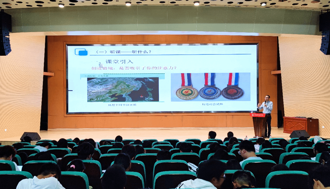 陈主任首先以《奇湖探险》为具体案例展示了一堂结合真实情境、内容丰富多彩的课例。接着,以《奖牌引发的思考》为题,分享了他以学生对学校运动会上所颁发奖牌材质的好奇心为线索,指导学生“提出问题”“作出假设”“实验探究”最终“解决问题”的过程,展示了一堂生动活泼的好课。陈主任还从“听课”“评课”“如何设计一节好课”以及“优秀化学教师的成长之路”四个方面为大家介绍了自己的心得体会。报告最后,他就化学教师教学基本功大赛相关要求给师生展开了具体的介绍。