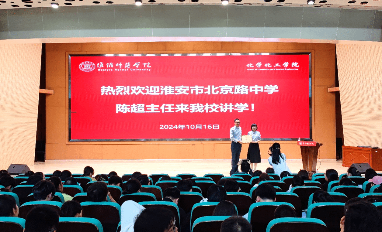 10月16日下午,淮安市北京中学德育处主任陈超应邀来到淮阴师范学院,为化院师生带来了一场题为“心之所向 行之所往”的主题报告。化学系部分教师和全体同学参加了本次活动。刘晓燕副院长主持报告并为陈主任颁发了证书。