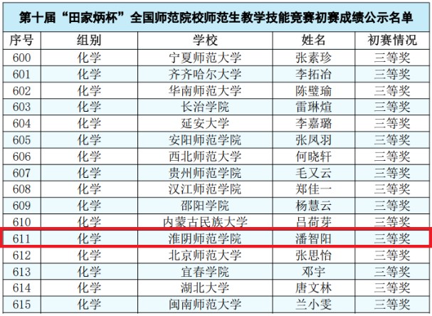 在10月中旬举办的第十届“田家炳杯”全国师范院校师范生教学技能竞赛初赛中,化院师范生潘智阳同学荣获三等奖。“田家炳杯”全国师范院校师范生教学技能竞赛是由全国师范院校师范生教学技能竞赛组委会主办,浙江师范大学承办的赛事。该竞赛是以交流师范生培养经验、促进师范生教学能力提升、培养优秀教师后备力量为目标的专业比赛,是目前师范生教学技能培养领域影响力最大的全国性赛事。