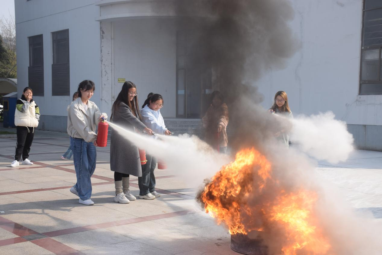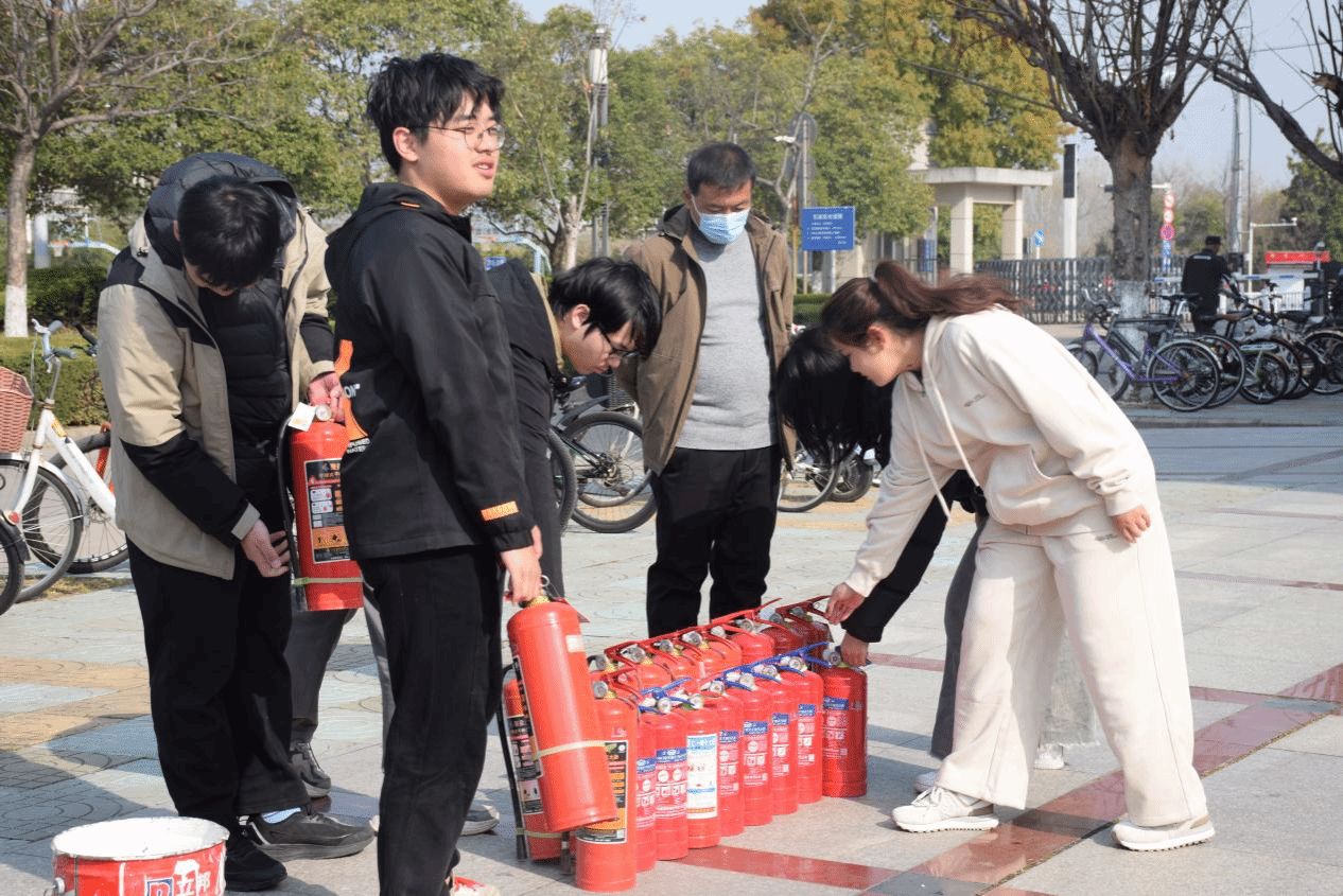 掌握技能,夯实安全根基。讲座结束后,王广慧老师带领40余名学生代表前往生化楼广场开展灭火器使用实操教学。教学现场,王广慧老师率先垂范,以标准且娴熟的动作演示了干粉灭火器的具体操作流程,从拔掉保险销,到握住喷管、按下压把,每一个步骤都精准到位、清晰明了。随后,在王老师的悉心指导下,学生们依次上前进行实际操作演练,亲身体验灭火器的使用方法,力求将所学技能内化于心、外化于行。