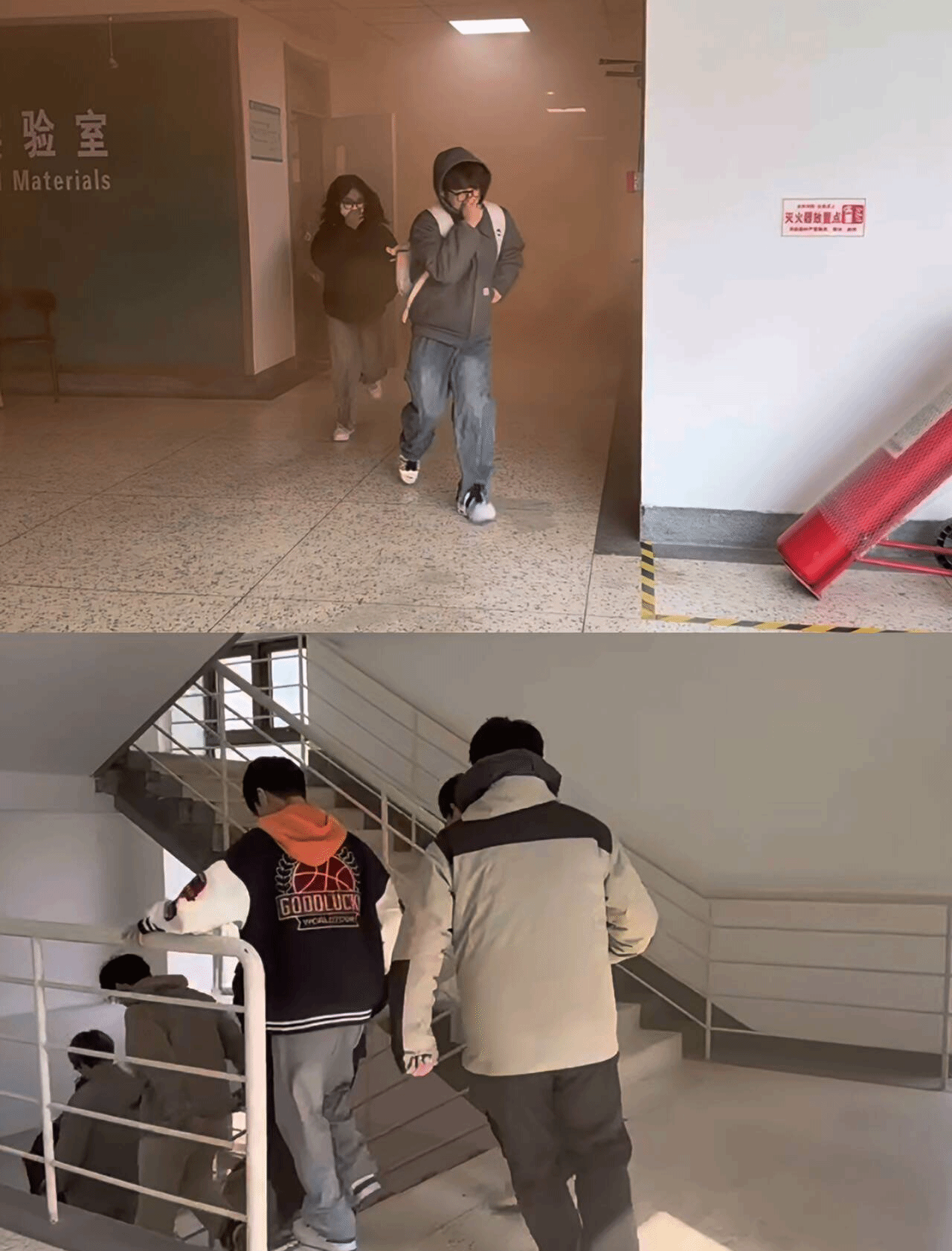 协同联动,检验实战能力。实战演练环节,学院在化学楼406-2、411和414实验室组织学生模拟开展了消防应急疏散演练活动。随着模拟烟雾弥漫并触发报警装置,一场紧张有序的应急疏散演练正式拉开帷幕。在保卫处专业人员与学院老师的有序指引下,40余名学生反应迅速,立刻用手、口罩等紧紧捂住口鼻,沿着既定的安全通道,有条不紊地撤离至生化楼广场。整个疏散过程组织严密、行动高效,充分彰显了学生们出色的应急响应能力与良好的安全素养。