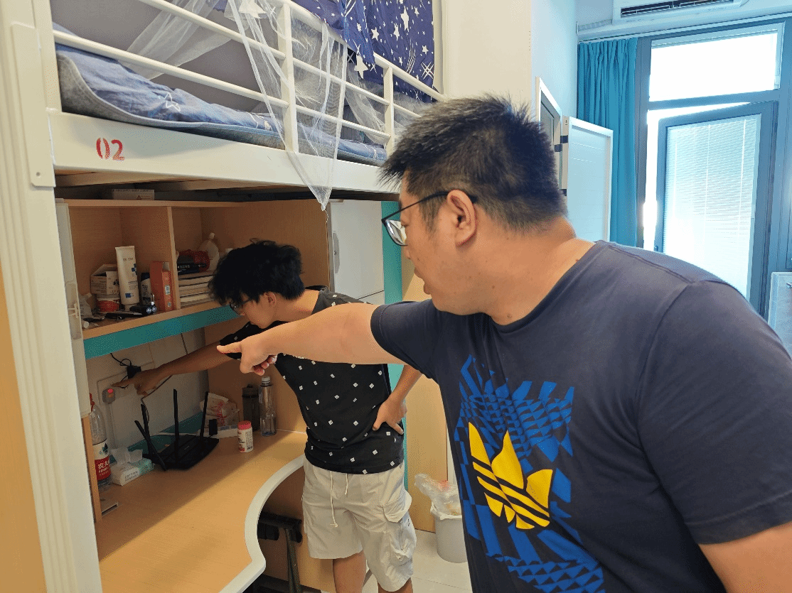 期间,唐力书记与李伟老师亲切走访了多个新生寝室,与同学们进行了深入交流。唐书记仔细查看了宿舍环境,关切地询问了新生的生活适应情况,并对内务整理成果给予了肯定。他勉励同学们要从日常起居做起,自觉维护宿舍环境,将宿舍打造成共同成长的温馨家园。李伟老师则结合安全案例,再次强调了遵守宿舍管理规定的重要性,提醒大家增强安全意识,共同守护宿舍安全。
