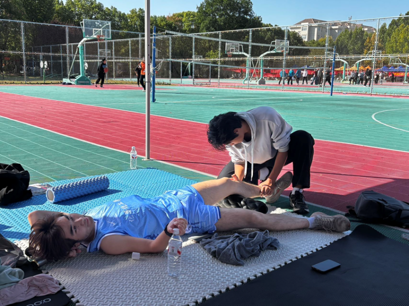 图为志愿者帮助运动员放松 化院通讯部摄