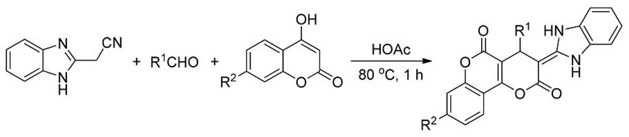 该研究实现了在醋酸促进下芳醛、2-氰甲基苯并咪唑和4-羟基香豆素的三组分串联环化反应,反应中醋酸既作为溶剂又作为布朗斯特酸催化剂。该研究为兼具苯并咪唑和香豆素并吡喃骨架杂环化合物的合成提供了一种绿色高效的策略。