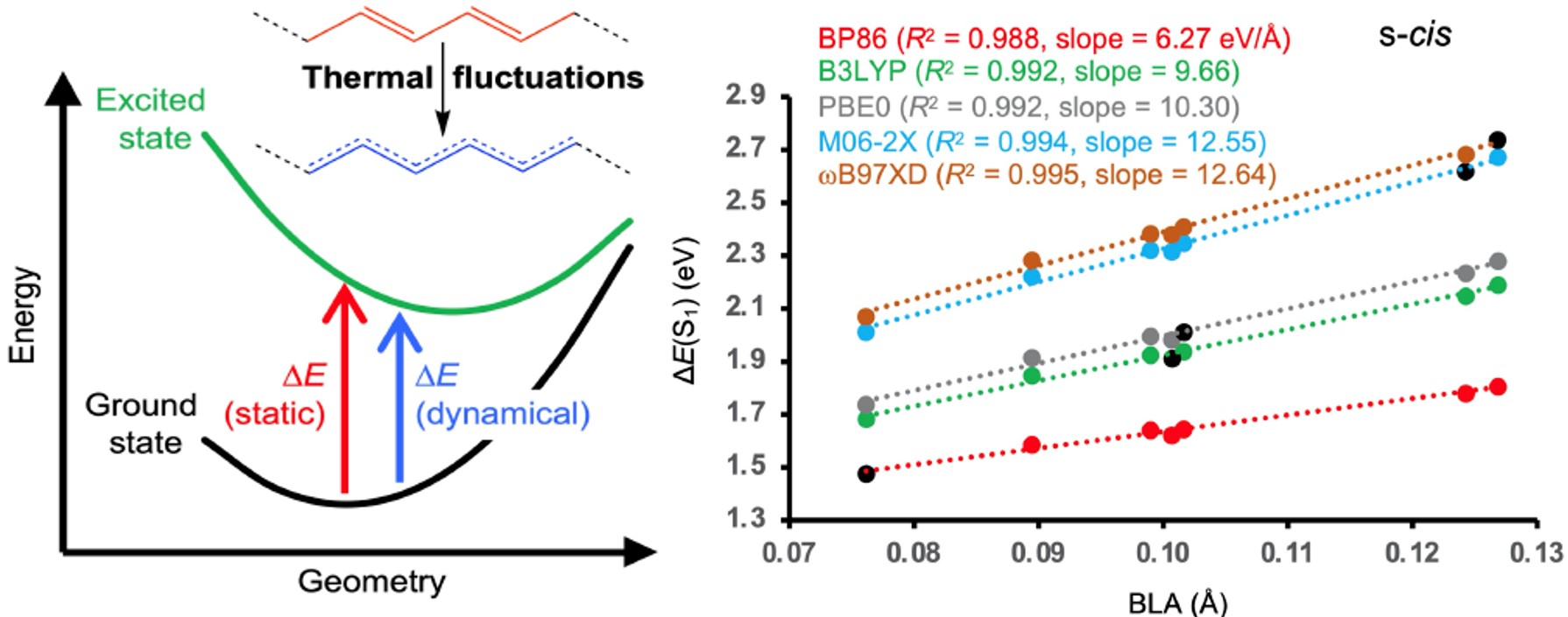 在计算激发能的时候,通常只考虑平衡构型而忽略热运动的影响。虽然这种静态方法对于具有不同势能极小值的分子是敏感的,但其受动态方法的影响还没有经过彻底的测试。该研究报道了一个新的案例,研究了分子动力学模拟的热运动对虾青素激发态亮态的影响。虾青素是一种具有广泛光生物学意义的类胡萝卜素,具有13个共轭双键。研究中采用了几种不同的密度泛函方法,结果表明共轭中的热波动导致玻尔兹曼加权平均激发能相对于从纯静态方法得倒的能量偏移高达0.05 eV。因此,研究可以得出:对于具有不同势能极小值的分子,热运动对共轭体系激发能的影响也可能相当大。