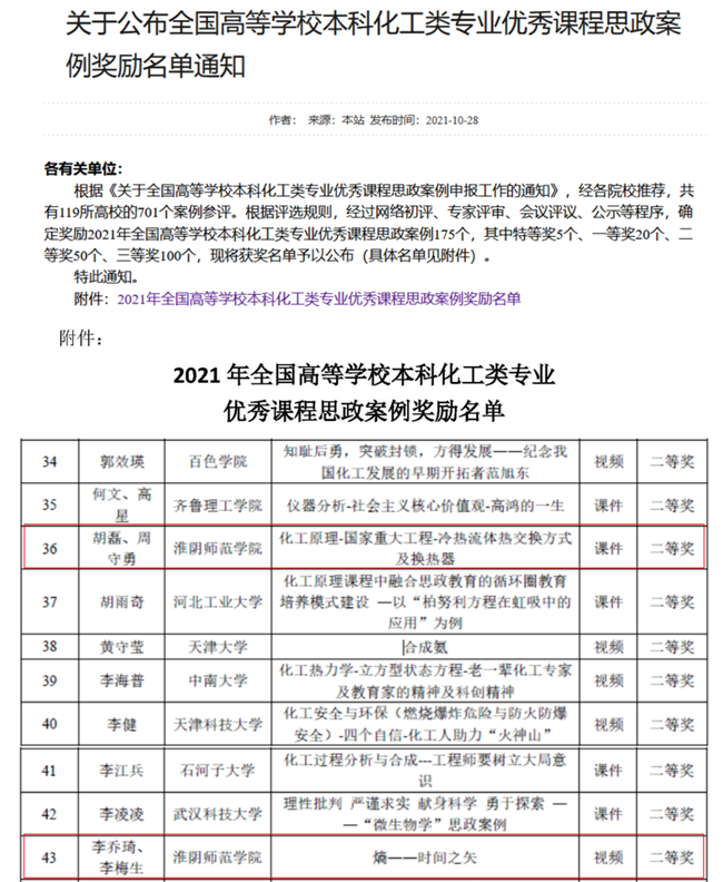10月28日,由教育部高等学校化工类专业教学指导委员会、中国化工教育协会、化学工业出版社有限公司联合主办的“全国高等学校本科化工类专业优秀课程思政案例”评选获奖名单公布,77779193永利官网胡磊/周守勇老师的《化工原理-国家重大工程-冷热流体热交换方式及换热器》以及李乔琦/李梅生老师的《熵——时间之矢》荣获二等奖,获奖总数位列江苏省高校第4位。