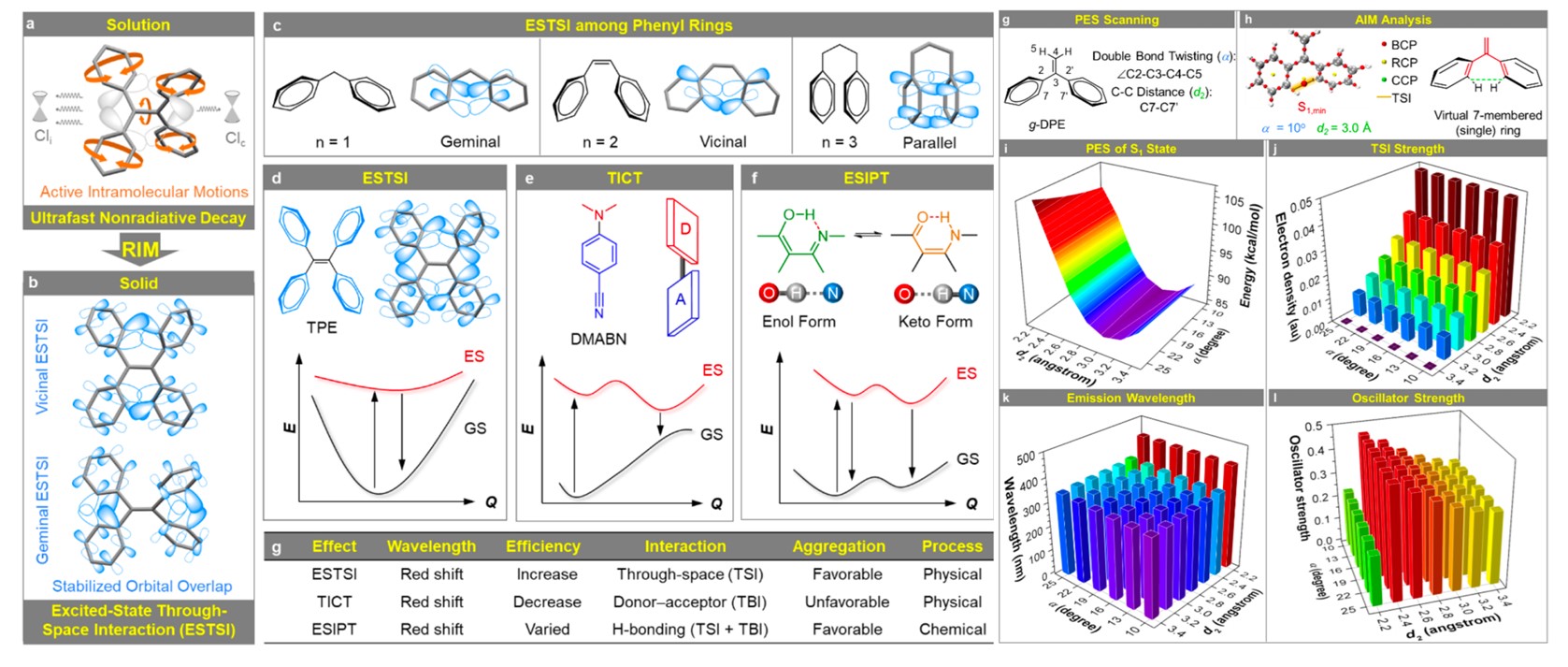 四苯基乙烯(TPE)是一个被广泛研究以及应用的聚集诱导发光(AIE)明星分子,这个仅有四个苯环加一个碳碳双键组成的简单分子展现出了异常奇妙的发光行为,但其背后神秘的光物理性质一直是学术界不断探索的理论难题。近日,上述研究者通过系统的实验与理论计算揭示了TPE在聚集态下展现出的增强蓝光发射来源于相邻苯环之间的分子内空间相互作用(TSI),而非曾经普遍认为的四个苯环与双键之间的价键共轭(TBC)。通过对TSI的定量分析以及激发态演化路径模拟,建立了TPE完整的光物理机理。该理论模型同时能够推广应用于多转子有机发光体系。
