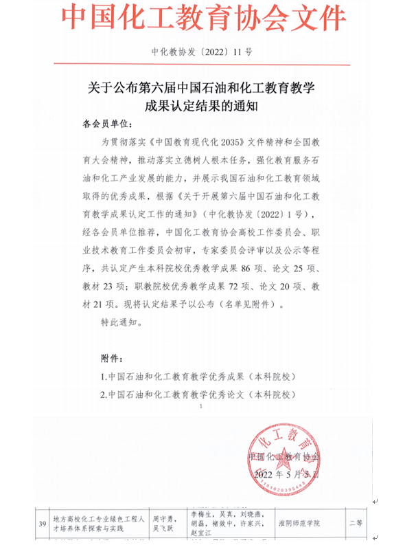 淮师获第六届中国石油和化工教育教学成果二等奖