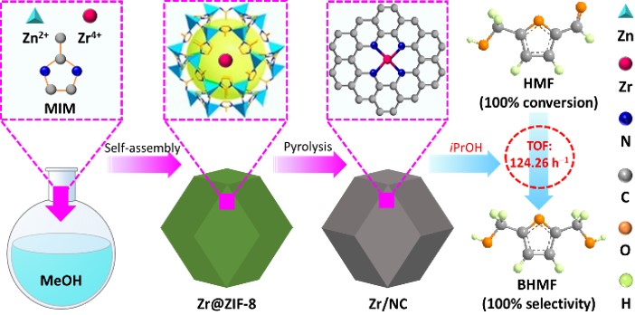 2,5-二羟甲基呋喃(BHMF)是一种新型的生物质基聚合材料单体,具备取代对苯二甲醇的潜力,能够广泛应用于合成聚酯类、聚醚类和冠醚类等高分子材料。MPV转移加氢策略是将生物质基平台化合物5-羟甲基糠醛(HMF)选择性转化为BHMF的有效途径,其中,设计开发高效低成本的催化剂是关键。研究团队针对不同氢供体的供氢能力和空间位阻,利用溶解热自组装法和牺牲模板法分别构筑了具有Zr4+-O2-酸碱对的木质素基双功能催化剂(Zr-EL)和具有Zr-N4配位结构的单原子催化剂(Zr/NC)。催化剂表征和实验结果表明:Zr-EL和Zr/NC均展现出了优异的催化活性和催化选择性,而且还具有良好的循环稳定性和底物普适性。相关研究成果为新型高效催化剂的再设计与改进和转移加氢体系的再完善与应用提供了重要参考。