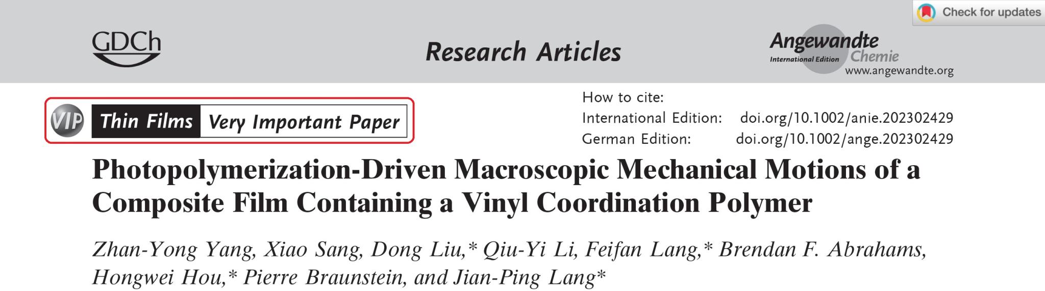 淮阴师范学院低维材料团队在《Angew. Chem. Int. Ed.》期刊发表题为“Photopolymerization-Driven Macroscopic Mechanical Motions of a Composite Film Containing a Vinyl Coordination Polymer”的论文,淮阴师范学院为共同完成单位。该论文入选《Angew. Chem. Int. Ed.》期刊VIP论文(Very Important Paper)。