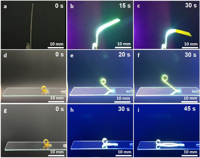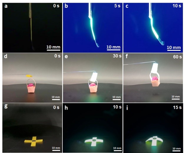 本文以多烯烃化合物为研究对象,通过配位自组装策略,设计并构筑了一种可将光能转化为机械能的一维光敏烯烃配位聚合物。光敏配位聚合物的纳米级粉晶能与聚乙烯醇均匀混合并形成复合膜,该复合膜表现出光聚合驱动的宏观机械运动行为。通过控制照射时间、光波长和光源位置,可以实现可控的弯曲、滚动、展开、提升、抓取和顶升等多种宏观光致机械运动。该工作不仅展示了一种在烯烃配位聚合物中合成一维有机聚合物的新方法,还基于光聚合反应将配位聚合物的微小晶格膨胀放大为宏观机械运动。研究结果为推动基于配位聚合物的光致驱动器在微机器人领域的发展开辟了新的视角。