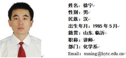 个人简历及学术经历:2017年7月毕业于南阳师范学院,获化学学士学位;2019年6月毕业于广西民族大学,获学科教学(化学)专业硕…[详细]